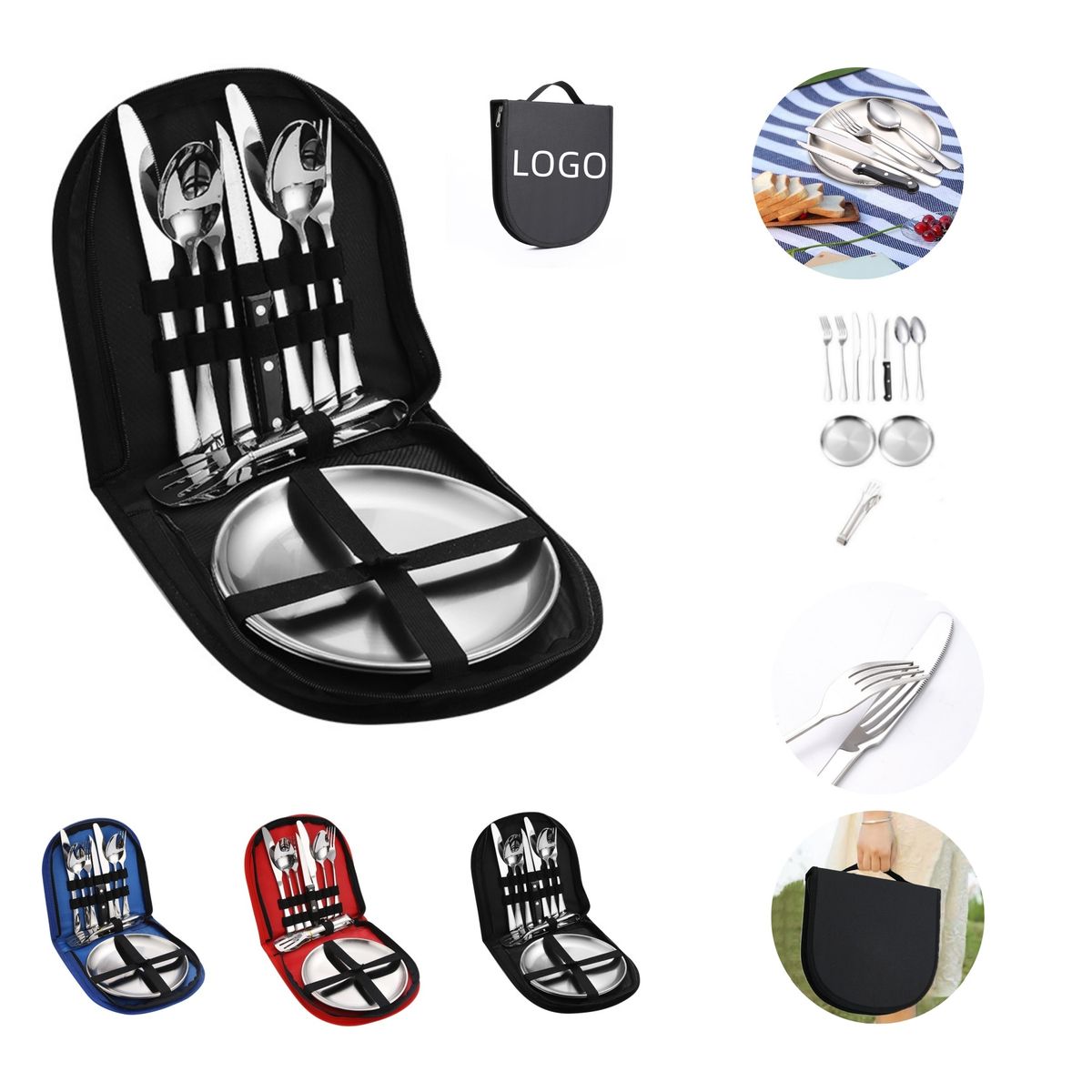 This is a stainless steel outdoor cutlery set, 1 pack of 10 pieces, including 1 clip, 2 spoons, 2 forks, 2 serrated knives, 1 butter knife, two 8-inch stainless steel plates, suitable for camping, backpacking, hiking and family picnics, can be stuffed into a suitcase, can be held in hand, and is made of tough cotton woven to protect your cutlery from harm and it with multiple compartments, the tableware remains strong and easy to clean during transportation.